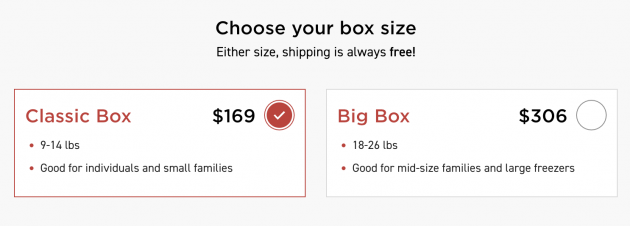 Once you choose which box you’d like, then you pick your monthly box size. You can choose between a Classic Box ($169/month) or a Big Box ($306/month). The price varies depending upon which type of meat box you chose.