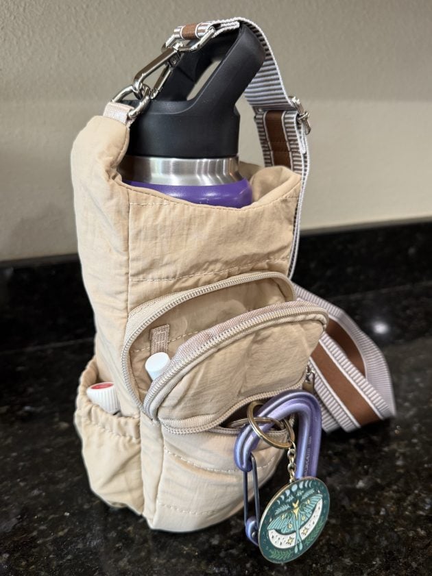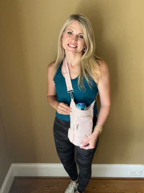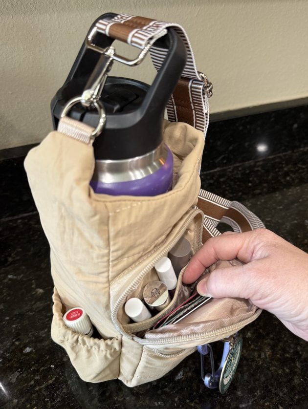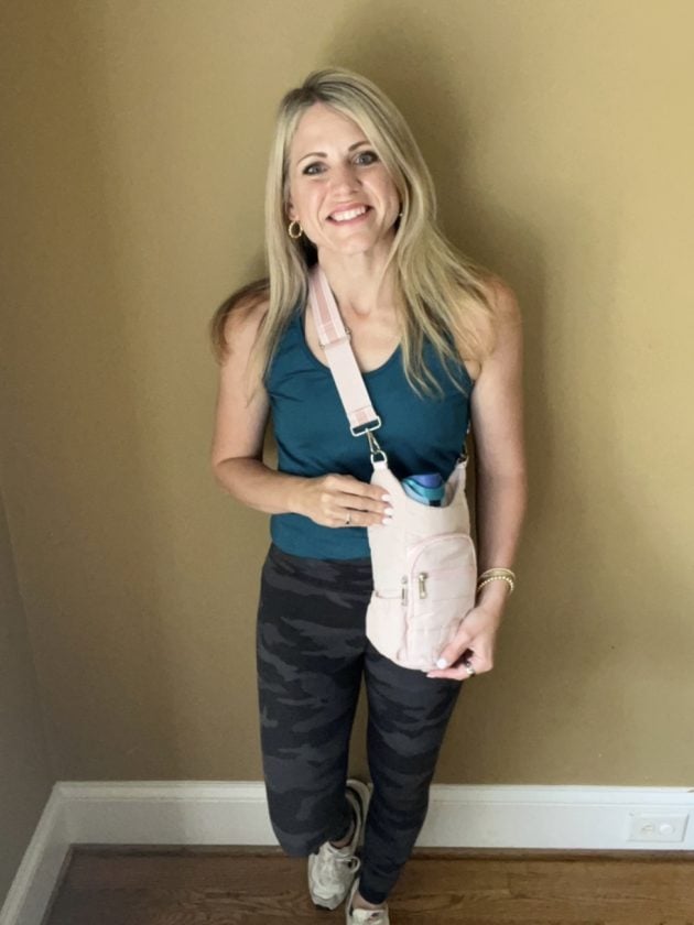 Meg here! This water bottle sling purse is PERFECT for running errands hands-free! There’s room for everything you need without having to take an entire purse. It fits my water bottle, keys, license and cards, cash, and makeup with room for more!