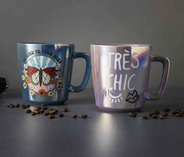 Get this Thyme & Table 2 Pack Kind to Your Mind Blue and Tres Chic Purple Pearlized Mugs for just $6!